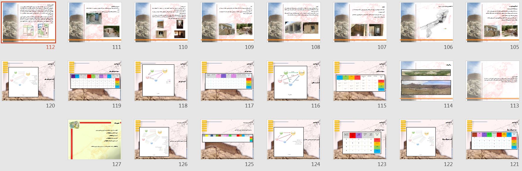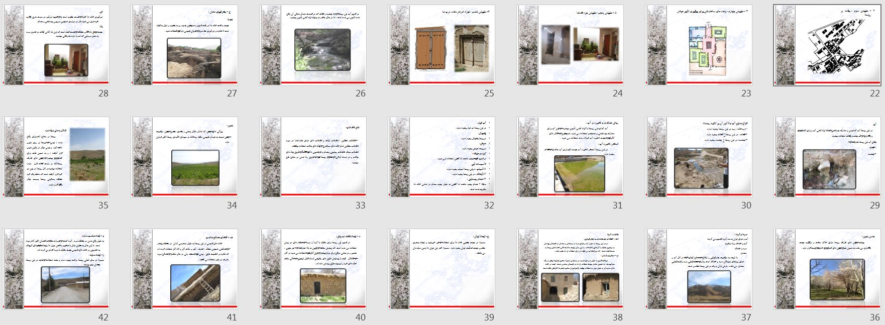 پاورپوینت بررسی معماری روستای سیمکان بوانات شامل ۱۲۷ اسلاید پاورپوینت بوده که قابل ارائه برای درس روستا ۱ و روستا ۲ می باشد. این فایل معماری توسط تیم تحقیق پروژه ها از روستای سیمکان شهرستان بوانات در استان فارس تدوین و عکسبرداری شده است. فایل ذکر شده شامل هفت فصل مطابق با درس روستا در رشته معماری است که قابل ویرایش می باشد.